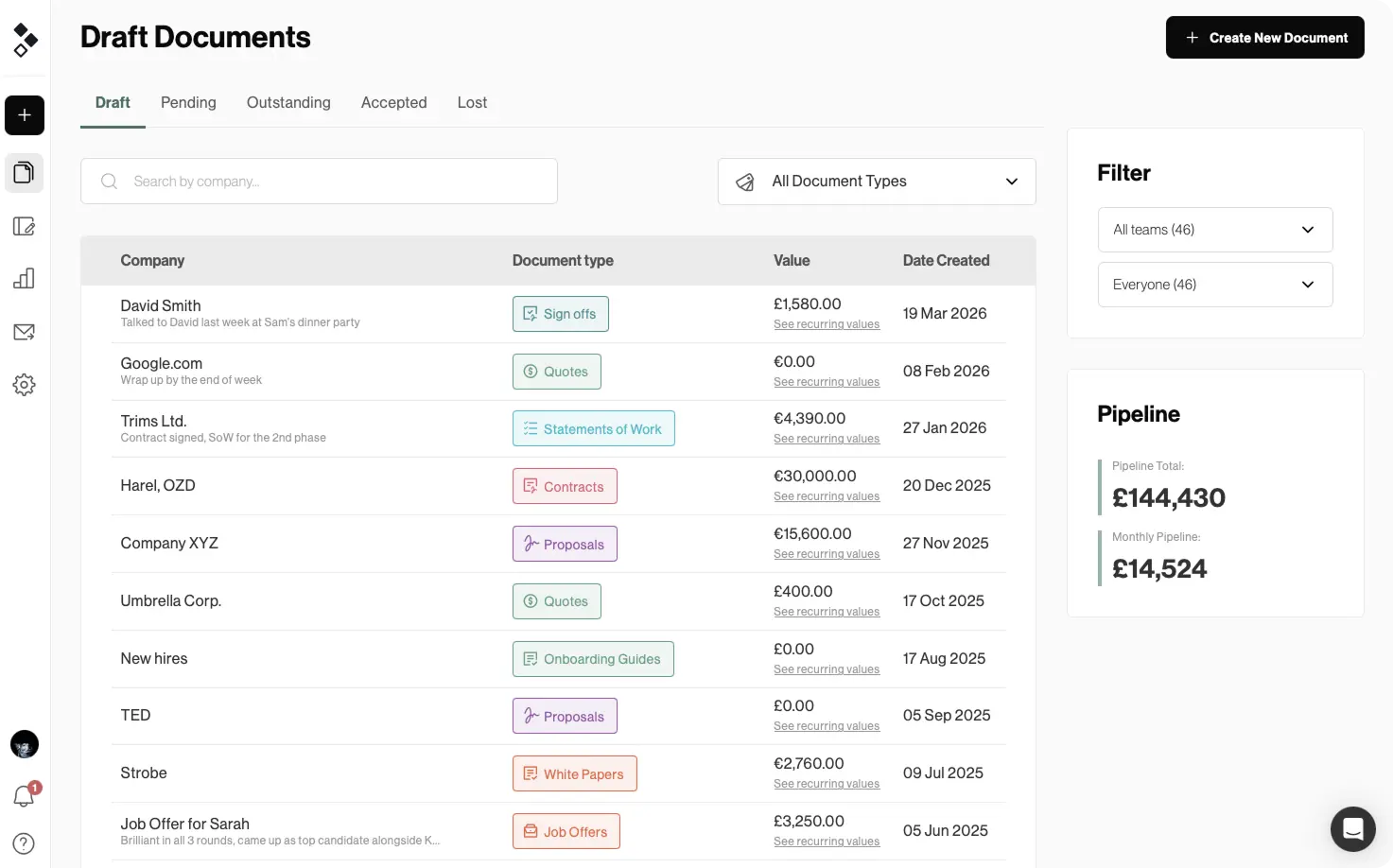 There’s no proper setup stage when creating a document, so you can’t assign a client or pull in key details at that point. There are also no document type labels to help you differentiate between proposals, contracts, and other documents.