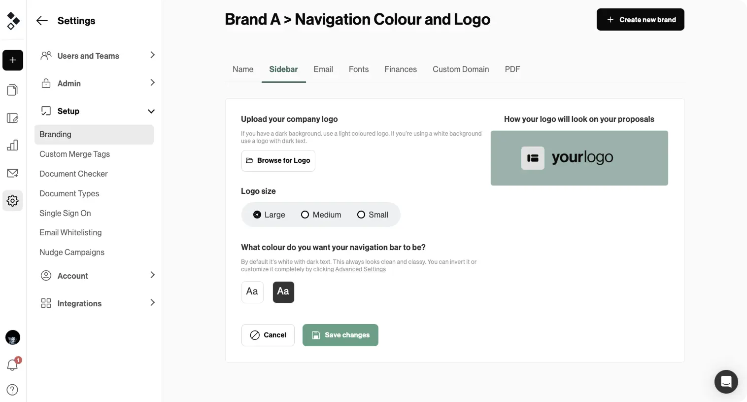 With Better Proposals, you’re not limited to a single setup. You can create and manage multiple brands, each with their own colours, fonts, logos, and financial settings. You simply need to choose which settings to apply to which document while creating it.